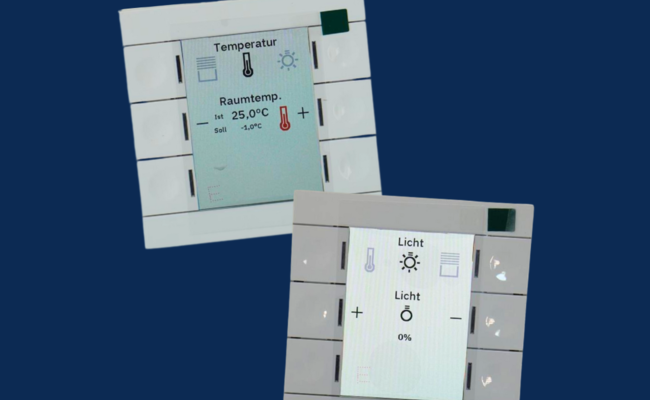 Darüber hinaus haben wir die Gebäudesystemtechnik in den Räumen übernommen und moderne Bedienelemente eingebaut, mit denen sich Jalousien und Raumtemperaturen komfortabel steuern lassen.